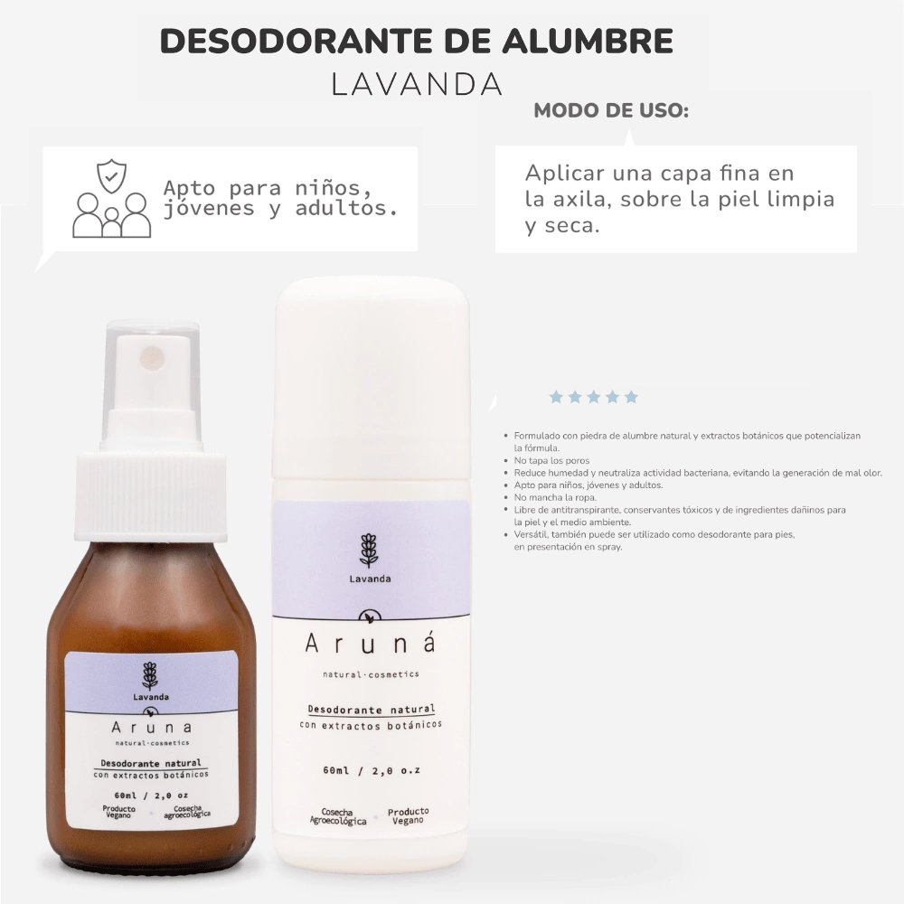 Disfruta de la ligereza del Desodorante en Spray de Lavanda Aruna, una alternativa natural que brinda frescura inmediata y protección efectiva, sin bloquear la transpiración natural de tu cuerpo.