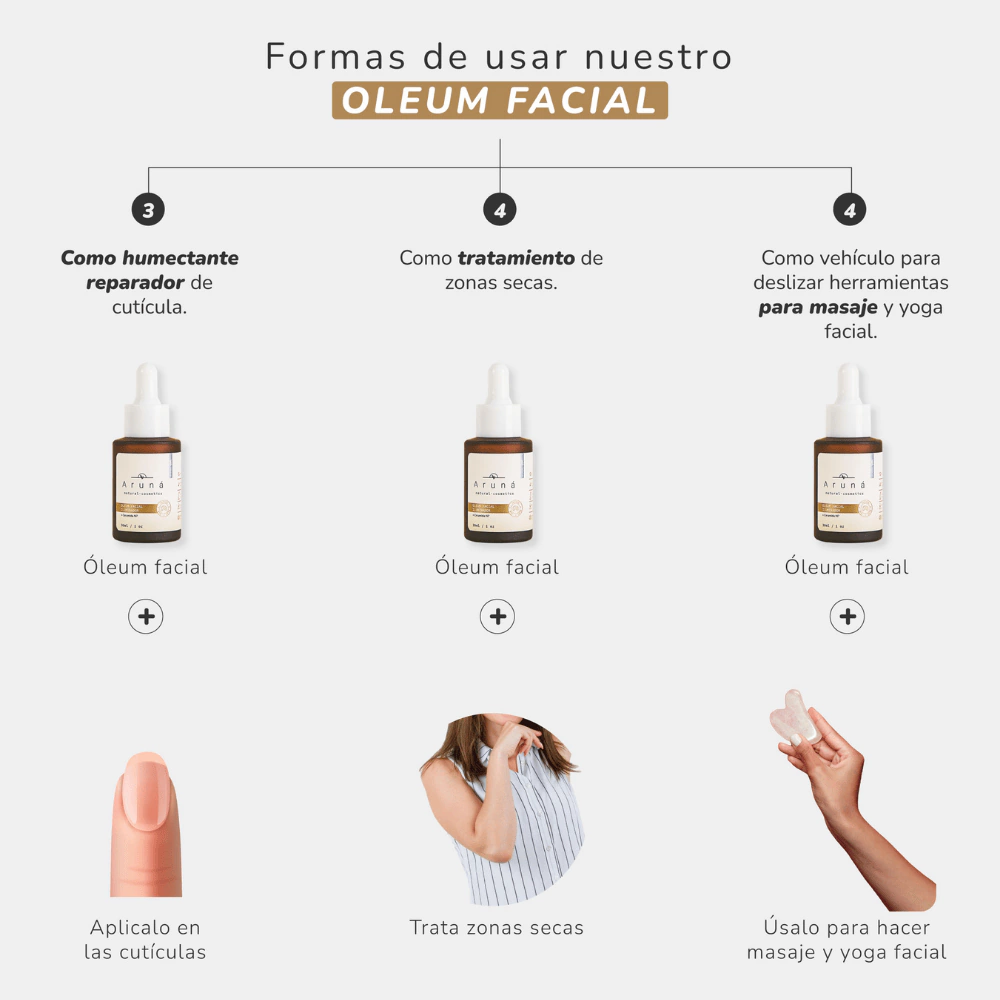 El Óleo Facial Humectante Neutro Aruna está diseñado para hidratar, suavizar y proteger todo tipo de piel, especialmente la más sensible. Sin fragancias ni aceites esenciales, es ideal para quienes buscan un cuidado facial puro, seguro y minimalista.
