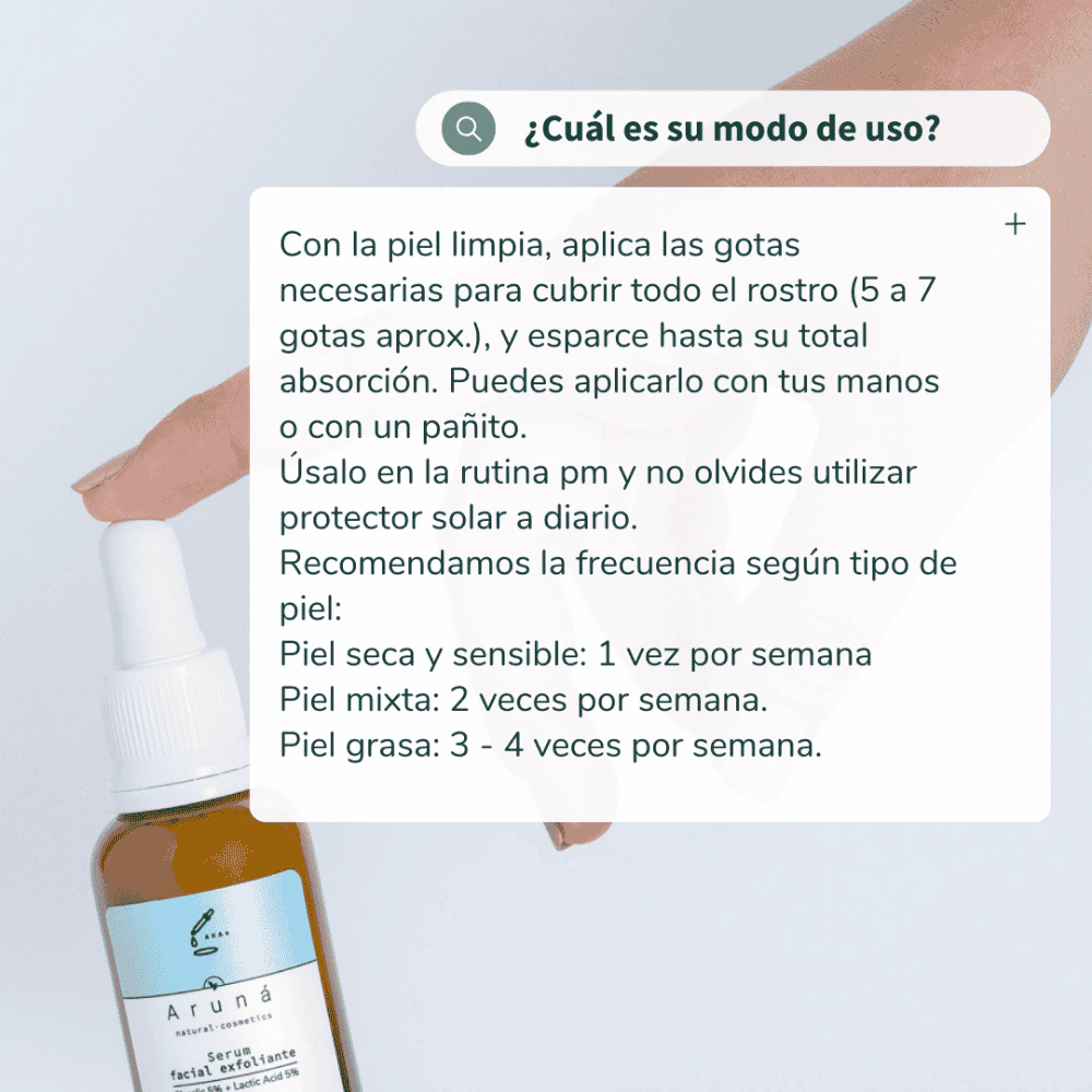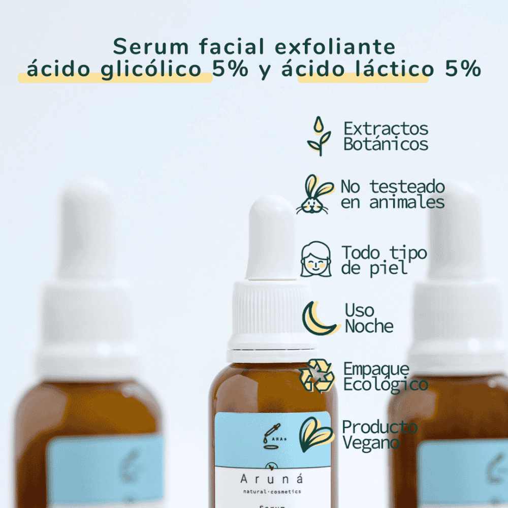 Recupera la vitalidad de tu piel con el Sérum Exfoliante de Ácidos Naturales Aruna, un aliado consciente para lograr un rostro más suave, uniforme y luminoso.
